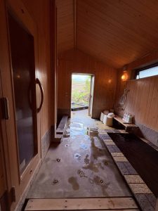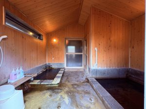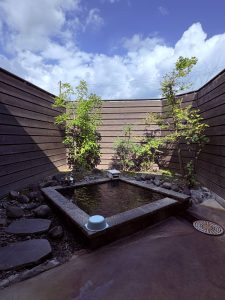 温泉かけ流し、泉質はナトリウム炭酸水素塩泉、浴槽の縁は檜・溶岩石・竹墨モルタルの3種があり、